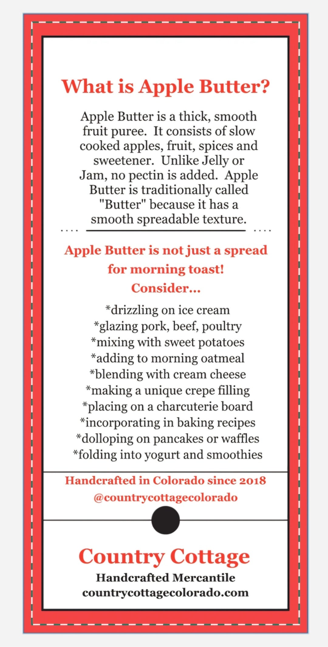 At Country Cottage, our Apple Butter is handcrafted in small batches with care and quality in mind. Unlike mass-produced brands, each jar is made slowly and thoughtfully to capture the full flavor of apples, fruits and spices, giving you a rich, homemade taste you won’t find in big-box varieties. Every spoonful delivers the warmth and comfort of a truly handcrafted product.